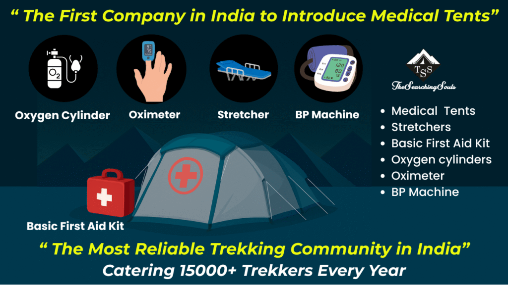 Medical Tents: TSS is the Only Company in the Country that Pitches dedicated Medical Tents to The Slopes at all their Campsites. The Medical Tents consist of a Stretcher, Oxygen Cylinder, First Aid Kits, Oxymeters, and a few other facilities depending on the Slope and the nature of The Terrain.