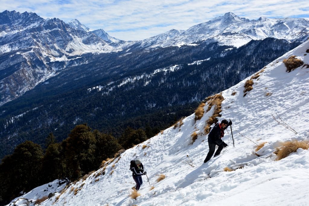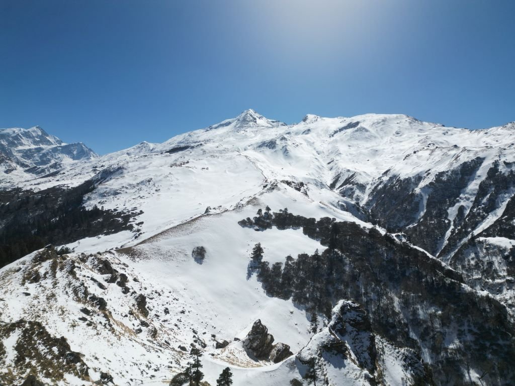 The Kuari Pass trek spans approximately 22 to 23 kilometers, making it one of the more approachable Himalayan trek especially in winters. This distance includes both ascent and descend, passing through forests, meadows, snow slopes, and ridgelines, thus attracting both beginners and experienced trekkers.