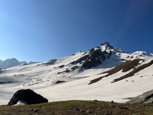 Sar, meaning pond, is often frozen until late summer and doesn’t fit the typical image of a mountain saddle to cross. From the pass, the view opens up to the east, revealing the towering peaks of the Tosh valley, while to the south, snow blankets the land and is surrounded by snow-capped mountains, including one that appears deceptively close.