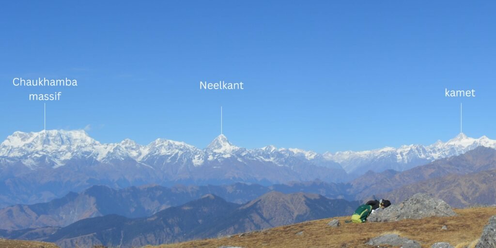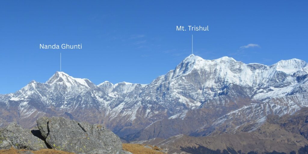 Brahmatal Base Camp: You’ll find yourself at an altitude of 3200m. From here, you can take in stunning views of various mountain ranges and the towering Himalayan peaks. The Peaks visible from Brahmatal lake are Mt. Trishul (7120m), Mt. Nanda Ghunti (6309m), Chaukhamba Range, Neelkanth Peak, Hathi Godha Peak, Panchachuli Range, Maikotli and Mrigthuni